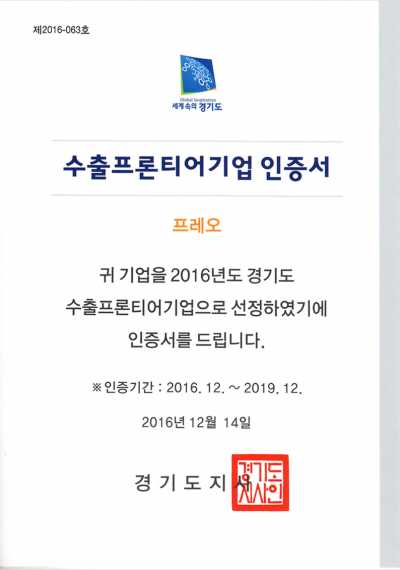 수출프론티어기업 인증서