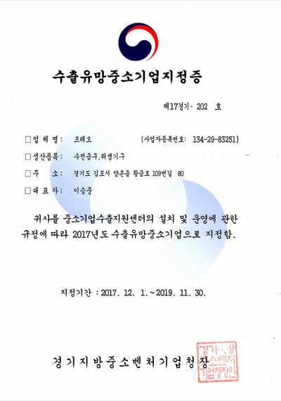 수출유망중소기업 지정증
